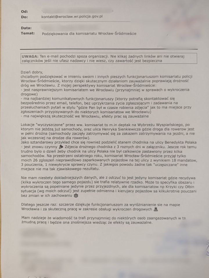Do Komendy Miejskiej Policji we Wrocławiu wpłynęło podziękowanie od mieszkańca, który wyraził uznanie dla pracy funkcjonariuszy z Komisariatu Policji Wrocław Śródmieście. W piśmie zwrócono uwagę na widoczną i efektywną działalność policjantów w zakresie porządku i bezpieczeństwa ruchu drogowego.