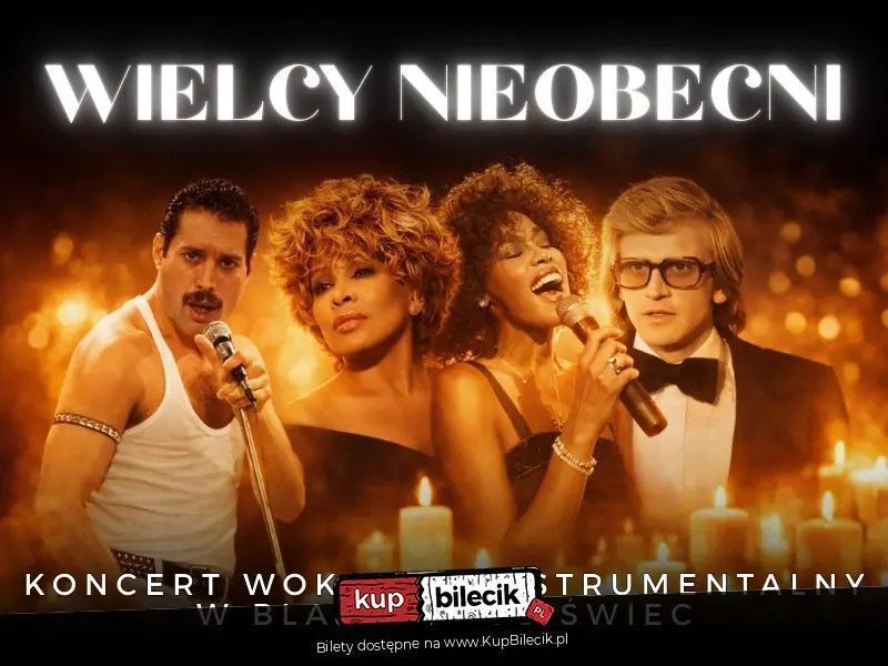 Wielcy nieobecni to pełna emocji muzyczna podróż przez utwory legendarnych wykonawców polskiej i światowej sceny. To spotkanie z głosami, które zapisały się w historii - od Zbigniewa Wodeckiego, Andrzeja Zauchy i Stanisława Soyki, przez Ninę Simone, Arethę Franklin i George"a Michaela, aż po Johna Lennona, Michaela Jacksona i zespół Queen. Każdy z tych artystów pozostawił po sobie nie tylko niezapomniane piosenki, ale także wyjątkową wrażliwość i emocje, które do dziś rezonują z publicznością.