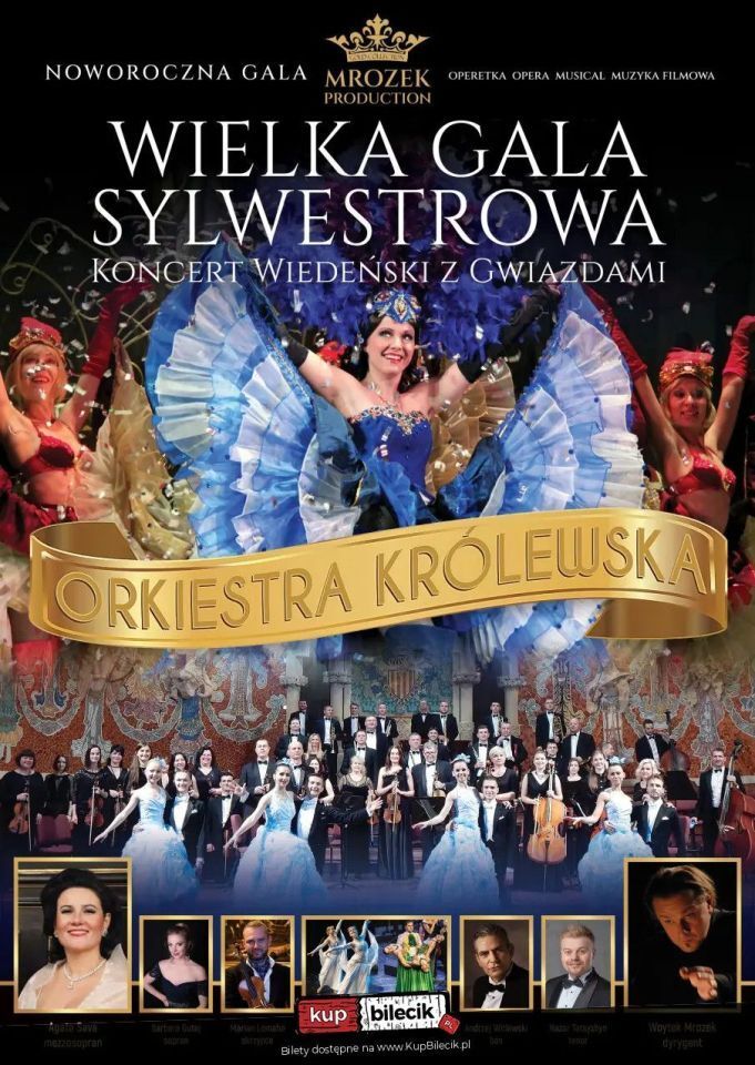 Wracamy i zapraszamy Państwa w podróż do roztańczonego, magicznego Wiednia oraz energetycznego Nowego Jorku, gdzie będą rozbrzmiewać najpiękniejsze arie, duety, walce i polki Johanna Straussa, Franca Lehara, Imre Kalmana a także największe szlagiery musicalowe, filmowe i światowe przeboje wszech czasów. Tegoroczny koncert w wykonaniu światowej. W programie udział wezmą międzynarodowi artyści - znani polskiej i międzynarodowej publiczności a wśród Agata Sava mezzosopran - solistka opery w Pradze, która koncertuje aktywnie na scenach całego świata takich jak: Chicago Philharmonic Hall, Filharmonia Narodowa w Warszawie, Lucerne Concert Hall i wiele innych. Jest absolwentką Hohschule fur Musik w Monachium. Barbara Gutaj sopran, solistka Teatru Wielkiego w Poznaniu, wyróżniona prestiżową Teatralną Nagrodą Muzyczną im. Jana Kiepury w kategorii "Najlepszy Debiut" za debiut na deskach Mazowieckiego Teatru Muzycznego. Debiut w Teatrze Wielkim Poznaniu miał miejsce podczas premiery "Fausta" A. Radziwiłła w reżyserii Adama Hanuszkiewicza, gdzie jej rolę Małgorzaty Józef Kański w "Ruchu muzycznym" określił jako "operowe odkrycie sezonu". Nazar Tatsyshyn - tenor niezaprzeczalnym numerem jeden wśród tenorów młodego pokolenia. Solista obdarzony pięknym głosem śpiewającym w najlepszej tradycji włoskiego Bel Canta jest solistą Opery Narodowej w Budapeszcie. Andrzej Witlewski aktor, wokalista - bas od lat współpracuje z wieloma instyucjami kultury polskiej. Koncert uświetni swoim udziałem niezwykły wirtuoz skrzypiec Marjan Lomaha, który ostatnie 3 lata spędził w Japonii koncertując w każdej sali koncertowej tego kraju. Lomaha koncertował również m.in.: w Filharmonii Berlińskiej, Concertgebow w Amsterdamie, w lipskim Gewandhaus. W tym roku wystąpi w Polsce. W jego wykonaniu usłyszymy wirtuozowskie parafrazy ze Skrzypka na dachu, Czardasza Montiego, utwory z repertuaru Roby Lakatosa. Całość koncertu poprowadzi znany światowej publiczności dyrygent i wirtuoz klarnetu Maestro Woytek Mrozek, który aktywnie koncertuje na całym świecie. "..Mrozek należy do grona poszukiwanych na świecie artystów..." napisała Süddeutsche Zeitung w Monachium. Artysta słynie z niekonwencjonalnych pomysłów i nieposkromionej wyobraźni. Artyści przeniosą słuchaczy do ojczyzny walca prezentując niezwykły kunszt wokalny i instrumentalny. Ta niezwykła gala będzie wzbogacona wirtuozerskim tańcem par tanecznych, barwnymi kreacjami i bogatą choreografią, co pozwoli na doświadczenie wielu doznań artystycznych w iście książęcym stylu. Pary taneczne to soliści Narodowego Teatru Opery i Baletu we Lwowie. W ten magiczny wieczór zabrzmią największe przeboje Króla walca Johanna Straussa takie jak uwertura z Zemsty Nietoperza, Keiser Marsz, Marsz Radezki, walc "Nad pięknym modrym Dunajem", "Odgłosy wiosny" a także polki Trich Trasch, Eljen Magiar Polka, Anne Polka, Gromy i Błyskawice i wiele innych orkiestrowych szlagierów. Nie zabraknie także popisowych arii i duetów z najsłynniejszych operetek: Zemsty Nietoperza, Barona Cygańskiego, Księżniczki Czardasza, Hrabiny Maricy, Wesołej Wdówki czy Krainy Uśmiechu. Publiczność wysłucha między innymi: arie "Adeli", "Czardasz Sylvi", kuplety Barinkaya "Wielka sława to żart", "Graj Cyganie", " Artystki z Variete", "Brunetki Blondynki" a także duety wszechczasów, m.in. "Usta milczą dusza śpiewa", "Jakże mam Ci wytłumaczyć", " Jedź do Verasdin", " Co się dzieje oszaleję", "W rytm walczyka", "Tłumy Franków" z Księżniczki Czardasza. Nie zabraknie także sztandarowych pieśni neapolitańskich takich jak: "Funikuli-Funikula", "O Surdato N"namurato". W drugiej części koncertu artyści zaprezentują się w repertuarze musicalowym, filmowym i światowych przebojów m.in.: "Za Tobą pójdę jak na bal" - K. Krawczyka, "Wielka Miłość" - S. Krajewskiego, "Delilah" - T. Jonsa, "Nella Fantasia" z filmu Misja, "New York-New York" - F. Sinatry, "Volare", "O sole mio" - w wersji E. Presleya, "Przetańczyć całą noc" z musicalu My Fair Lady, "Gdybym był bogaczem" z musicalu Skrzypek na dachu i wiele innych noworocznych, muzycznych niespodzianek.