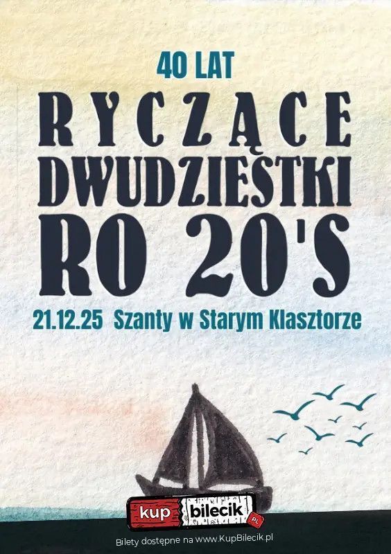 RYCZĄCE DWUDZIESTKI zapraszają wszystkich na wspólny rejs przez rozbujane wody piosenki żeglarskiej. Spotkanie z zespołem zawsze obfituje w muzyczne wrażenia estetyczne i gwarantuje wszystkim radosną pracę rękoma przy rytmicznych szantach - morskich pieśniach pracy. Nie zabraknie romantycznych ballad jak i energetycznych piosenek autorskich - wszystko w nurcie folk i opakowane marzeniami o dalekich podróżach po kres horyzontu. Zespół od 1983 roku koncertuje w Polsce oraz za granicą. Dotychczas spotkał się z uznaniem w takich krajach jak Norwegia, Niemcy, Holandia, Kanada, Stany Zjednoczone Ameryki i nawet Słowacja "Hiszpańskie Dziewczyny", "Few Days", czy "Jasnowłosa", to piosenki, które powinny być wystarczającą zachętą do rozśpiewanego spotkania.