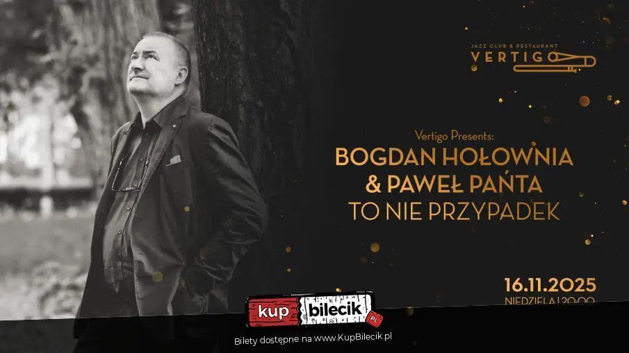 Bogdan Hołownia i Paweł Pańta w wyjątkowym duecie. Piotr Guzek Impresariat i Vertigo Jazz Club & Restaurant zapraszają na kolejny koncert z cyklu "Akustyczny Jazz" - projekt pod tytułem "To nie przypadek". Album o tym samym tytule to efekt spontanicznego spotkania dwóch wybitnych muzyków - pianisty Bogdana Hołowni i kontrabasisty Pawła Pańty. Początkowo planowane nagranie w trio nie doszło do skutku, lecz artyści wykorzystali czas w studiu, tworząc niezwykle spójny i intymny duet. Na płycie znalazły się wyłącznie polskie piosenki - od przedwojennych po współczesne - w nowych, pełnych ciepła i swobody interpretacjach. Utwory takie jak Przed nocą i mgłą, Nie oczekuję dziś nikogo, Tyle jest miast, Ulice wielkich miast, Czas rozpalić piec czy Déjà vu zyskały tu świeże, kameralne brzmienie. Hołownia i Pańta z niezwykłym wyczuciem budują dialog pomiędzy fortepianem a kontrabasem, tworząc muzykę subtelną, nastrojową i głęboko poruszającą.