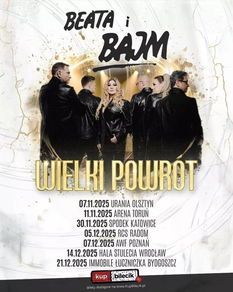 Już 14 grudnia Hala Stulecia Wrocław zamieni się w stolicę rocka! Jedna z największych ikon polskiej sceny muzycznej - Beata wraz z zespołem BAJM - powraca na wielką trasę koncertową! To wyjątkowa okazja, by usłyszeć na żywo największe hity, które od lat poruszają serca fanów. Energetyczne show, niezapomniane emocje i niepowtarzalny głos Beaty - to gwarancja muzycznego święta. To będzie niezapomniana muzyczna podróż pełna wzruszeń, wspomnień i nowych emocji.