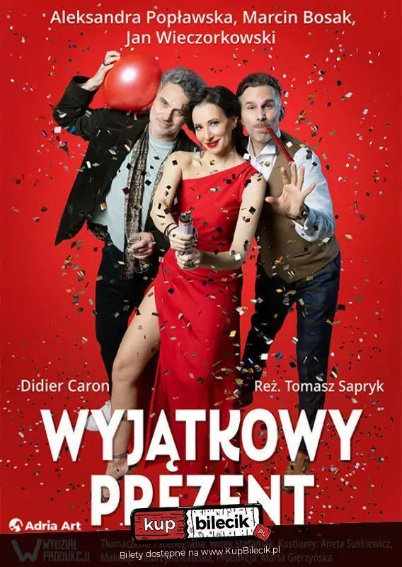 Co podarować człowiekowi, który zdaje się mieć już wszystko i z którym łączy nas ponad trzydzieści lat przyjaźni? Nieśmiertelne skarpetki, krawat czy może coś bardziej wyszukanego? Decyzja nie jest łatwa, a jeden odważny i drogi prezent może zrujnować nie tylko urodzinową imprezę, ale także może wpłynąć na dalszą przyjaźń i relacje rodzinne. Ciekawe, co to może być... Eric kończy 50 lat, a jego żona Sabine postanowiła uczcić tę wyjątkową rocznicę kameralną kolacją w towarzystwie najlepszego przyjaciela i wspólnika - Gilles"a. Kolacja zapowiada się obiecująco, jednakże ekstrawagancki podarunek wystawi ich relację na próbę. Ten wieczór okaże się mniej spokojny, niż pierwotnie planowano. Przygotujcie się na śmiech, emocje i zaskakujące zwroty akcji, bo komedia teatralna "Wyjątkowy prezent" zaskakuje każdego. Znakomita gra aktorska sprawi, że wczujesz się w historię bardziej niż kiedykolwiek! Gotowi?