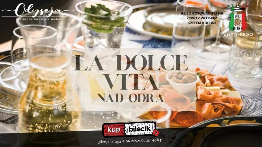 bilety: Zapraszamy na wyjątkową ucztę, która przeniesie Was prosto do słonecznej Italii! W magicznej scenerii rejsu po Odrze, nasz mistrz kuchni Simone, przygotuje na żywo dania inspirowane tradycyjnymi smakami Italii. Zanurz się w klimacie włoskiej dolce vita, delektując się aromatycznymi potrawami, dobrym winem i niepowtarzalnym widokiem Wrocławia od strony rzeki. Czekają na Was niezapomniane chwile, wypełnione muzyką, śmiechem i prawdziwie włoską gościnnością. Podczas rejsu Simone ugości Was przystawką, daniem głównym i sporą ilością wina: Czas trwania rejsu: 60/70 min. La Dolce Vita artyści: ZwodowaniZapraszamy na wyjątkowy event, który przeniesie Cię prosto do słonecznej Italii! W magicznej scenerii rejsu po Odrze, nasz mistrz kuchni, przygotuje na żywo dania inspirowane tradycyjnymi smakami Italii. Czekają na Ciebie niezapomniane chwile, wypełnione muzyką, śmiechem i prawdziwie włoską gościnnością. Bilety do nabycia na: KupBilecik.pl |