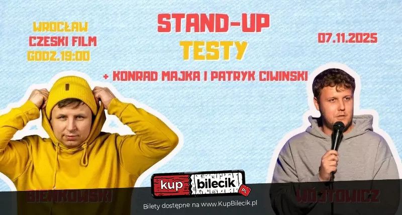 | TESTY Stand-up: Wójtowicz, Bieńkowski, Ciwiński, Majkadodano 2025-10-21 11:14:32 Zapraszamy na wieczór z komedią na żywo w najlepszym wydaniu. W klimatycznym Czeskim Filmie swoje występy przedstawi aż 4 wykonawców, a ich zróżnicowane podejście do stand-upu sprawi że będzie to wyjątkowe wydarzenie. 07.11 zaprezentują się: - Konrad Majka To będzie wieczór różnorodnych głosów, stylów i doświadczeń - pojawią się osoby z dużym scenicznym dorobkiem, ale także Ci, dla których będzie to pierwszy raz. Usłyszycie świeże pomysły i żarty oraz materiał przywieziony z domowych szuflad. To wspólna celebracja odwagi, procesu twórczego i radości z bycia na scenie. Grzesiek Wójtowicz pochodzący z Kędzierzyna-Koźla, młody człowiek, który swoje aktualnie życie związał z aktywnym komediowo Wrocławiem. W głowie ma równie poukładane co spodnie w sklepie w którym pracuje. Zapytany w jednym z wywiadów, aby opisał swoją osobę w 2 słowach odparł "-Kasjer-sprzedawca". Jeden z tych, o których śmiało możemy powiedzieć "baby face killer" - bardzo dynamicznie rozwija swoje komediowe umiejętności i paletę żartów. Charakteryzuje go, jakże jeszcze ciągle młodzieńcze, zafascynowanie codziennością i tym w jak dziwnym otoczeniu przyszło mu żyć. Marcel Bieńkowski to polski stand-uper, znany z celnych obserwacji i swobodnego stylu scenicznego. Jego występy, takie jak "Pochopny Optymizm" czy "Leniwy Roast Hajsu", dostępne są na kanale YouTube Stand-up Polska. Był uczestnikiem Wielkiej Trasy Stand-up Polska w 2024 roku. Bilety do nabycia na: KupBilecik.plSocial Komedia artyści: Różni artyściZapraszamy na wieczór stand-up! Będziemy mówić żarty i będzie bardzo śmiesznie, to tyle jeśli chodzi o przebieg wydarzenia. Bilety do nabycia na: KupBilecik.pl |