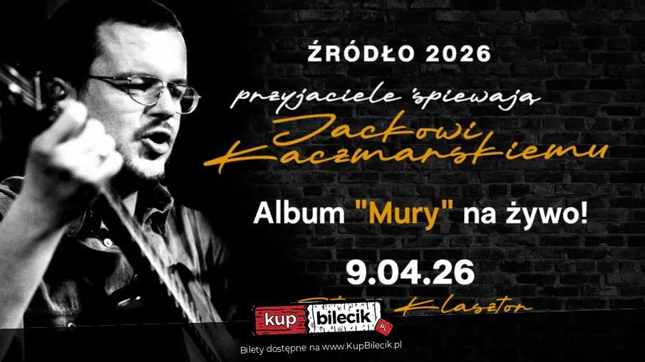 | Album "Mury" na żywo!dodano 2026-02-10 19:14:56 Przed nami tegoroczna edycja Festiwalu "Źródło", który - tradycyjnie - powraca wraz z wiosną. 9 kwietnia, w wigilię 22. rocznicę śmierci Jacka Kaczmarskiego, zapraszamy do Starego Klasztoru, a wspominać będziemy pieśni największego polskiego barda w szczególnym wydaniu. Ideą tegorocznego koncertu festiwalowego będzie przypomnienie kultowego albumu "Mury" - wydanego przez Jacka Kaczmarskiego, Przemysława Gintrowskiego i Zbigniewa Łapińskiego w 1981 roku. Album jest zapisem programu stworzonego jeszcze w 1978 roku. "Mury" to pierwsza płyta legendarnego trio, dziś mająca status kultowej, zawierająca słynną wersję pieśni katalońskiego barda Lluisa Llacha "L`estaca", a także takie otwory jak m.in. "Krajobraz po uczcie", "Ze sceny", "Encore, jeszcze raz", "Starzy ludzie w autobusie" "Pompeja" czy, będące tytułem rocznicowego koncertu, "Źródło". Uwaga! Źródło - przyjaciele śpiewają Jackowi Kaczmarskiemu artyści: Różni wykonawcyTwórczość największego polskiego barda przypomną jego muzyczni spadkobiercy skupieni wokół Wrocławskiego Salonu Jacka Kaczmarskiego. Bilety do nabycia na: KupBilecik.pl |