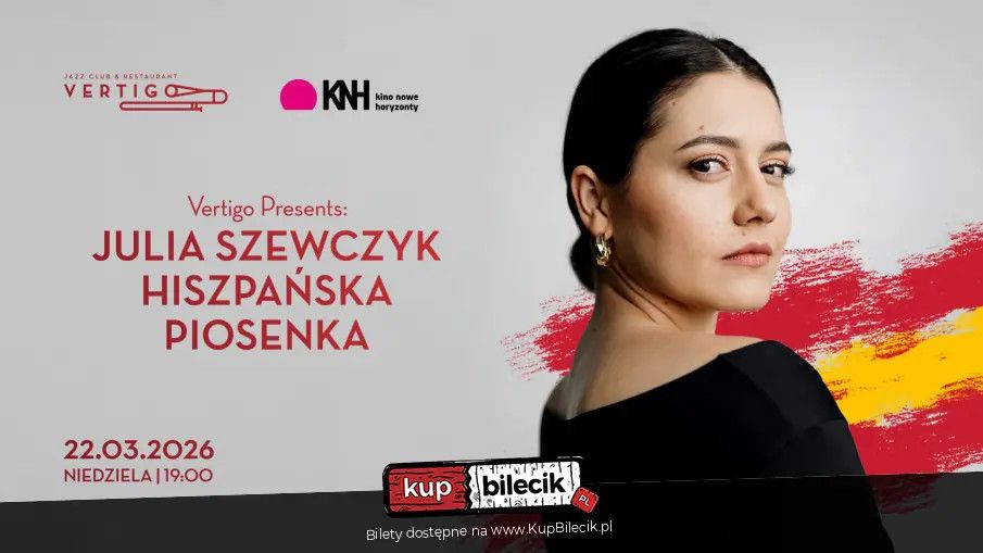 bilety: Wyjątkowy wieczór z hiszpańską piosenką w Vertigo. Zapraszamy Państwa do Vertigo we Wrocławiu na wydarzenie z muzyką na żywo, podczas którego zabrzmią najpiękniejsze hiszpańskojęzyczne utwory pełne pasji, temperamentu i południowego klimatu. To propozycja dla wszystkich, którzy chcą doświadczyć muzyki na żywo w eleganckiej, nastrojowej przestrzeni Vertigo i poczuć energię kultury krajów hiszpańskojęzycznych. Muzyka na żywo pełna emocji i południowych rytmów. Wieczór poprowadzi doskonale znana Państwu wokalistka Julia Szewczyk wraz z zespołem. Energetyczne rytmy oraz nastrojowe ballady przeniosą publiczność na słoneczne place Hiszpanii i do miast Ameryki Łacińskiej. Muzyka na żywo zabrzmi w pełnych emocji interpretacjach, tworząc wyjątkową atmosferę spotkania z kulturą i dźwiękiem. Wydarzenie we współpracy z kinem Nowe Horyzonty. To wydarzenie odbywa się we współpracy z kinem Nowe Horyzonty i jest częścią festiwalu kina hiszpańskiego organizowanego w kinie. Wieczór w Vertigo doskonale łączy świat filmu i muzyki, oferując Państwu spójne, kulturalne doświadczenie w sercu Wrocławia, gdzie jazz, muzyka na żywo i hiszpańskie inspiracje spotykają się w jednym miejscu. * Bilet nie jest gwarancją miejsca siedzącego. Lokal po godzinie 19:00 przeznaczony jest dla osób powyżej 18 roku życia, a osoby niepełnoletnie nie zostaną wpuszczone na wydarzenia organizowane przez Vertigo Jazz Club & Restaurant. Bilety do nabycia na: KupBilecik.plVertigo Presents artyści: Różni wykonawcyZapraszamy na koncerty w Najlepszym we Wrocławiu klubie i restauracji, z muzyką jazzową na żywo. Wieczorami klub przeznaczony jest wyłącznie dla osób pełnoletnich. Bilety do nabycia na: KupBilecik.pl |